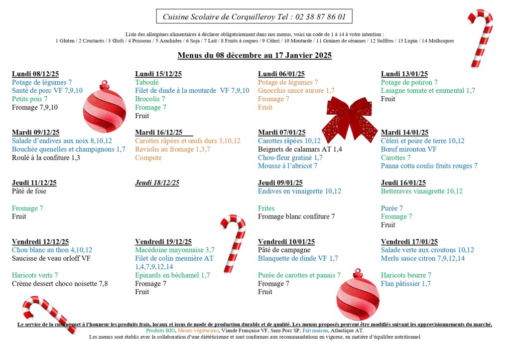 Menus du restaurant scolaire du 08 décembre 2025 au 17 janvier 2026