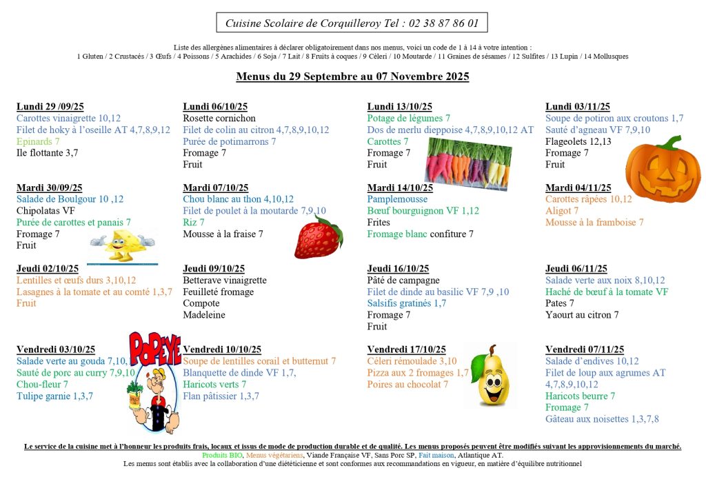 Menus du restaurant scolaire du 29 septembre au 07 novembre 2025