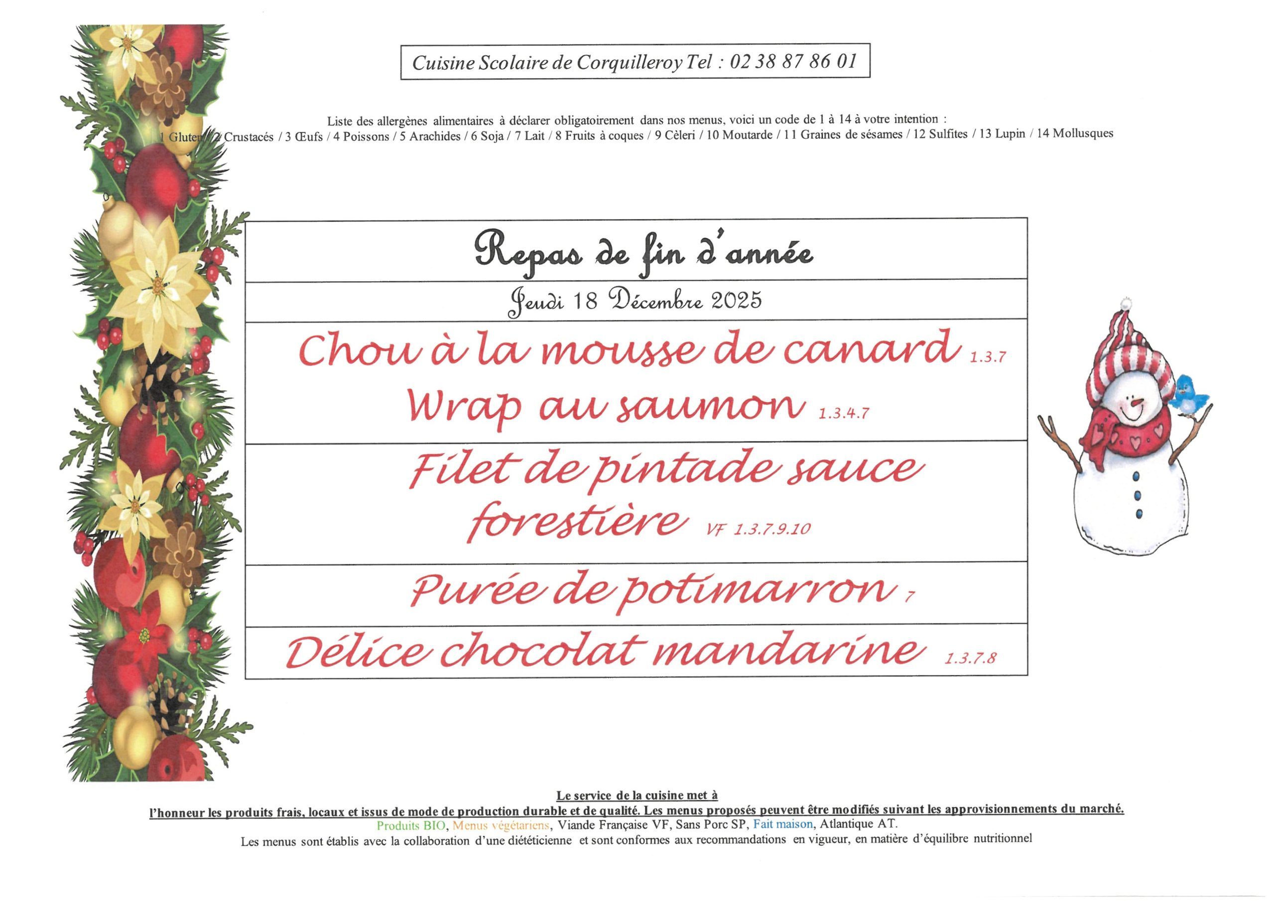 Menus du restaurant scolaire du 08 décembre 2025 au 17 janvier 2026